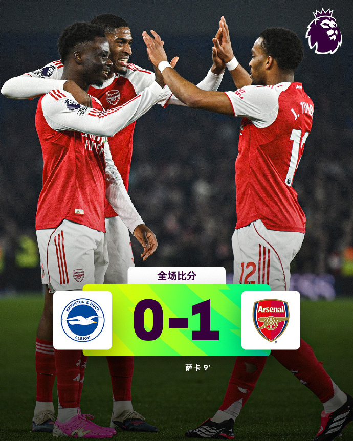 作为英超领头羊,阿森纳凭借萨卡第9分钟的兜射制胜,1-0力挫布莱顿。阿森纳联赛7轮不败,并且豪取3连胜。