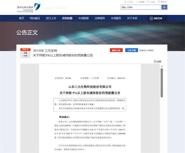 鲁网3月19日讯3月18日,深圳证券交易所官网发布的公告称,持有山东三元生物科技股份有限公司(以下简称“三元生物”)股份1285.2万股的股东吕熙安计划减持公司股份不超过100万股。